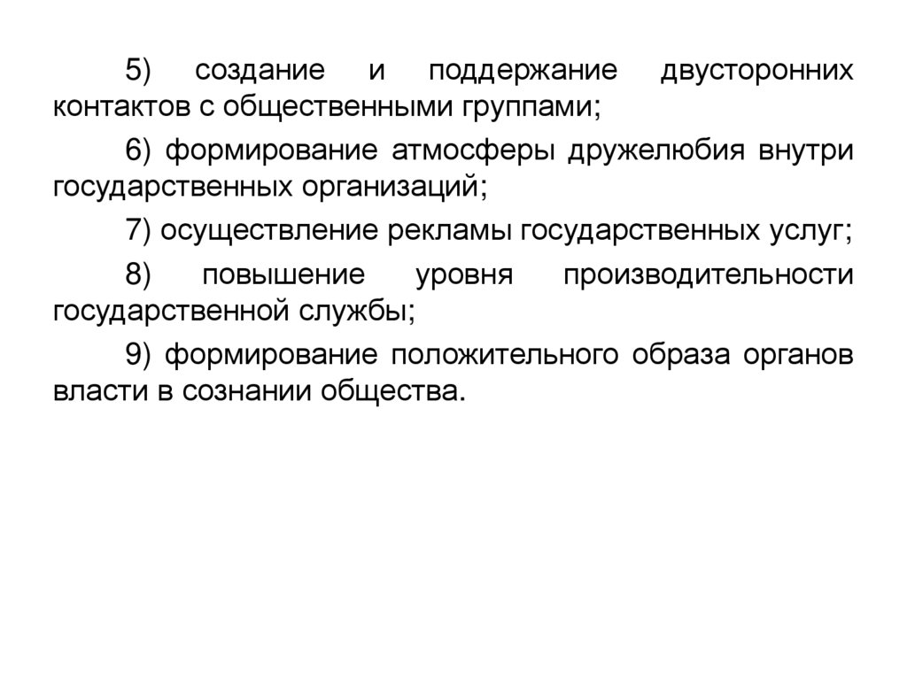 5) создание и поддержание двустороннихконтактов с общественными группами;