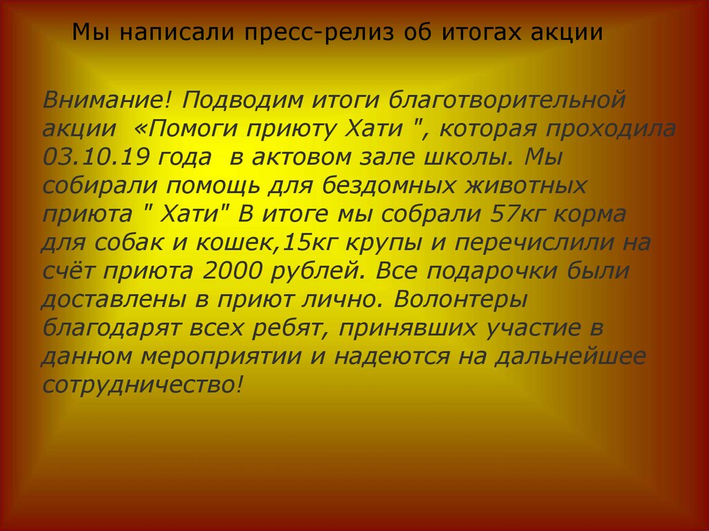 Мы написали пресс-релиз об итогах акцииВнимание! Подводим итоги благотворительной