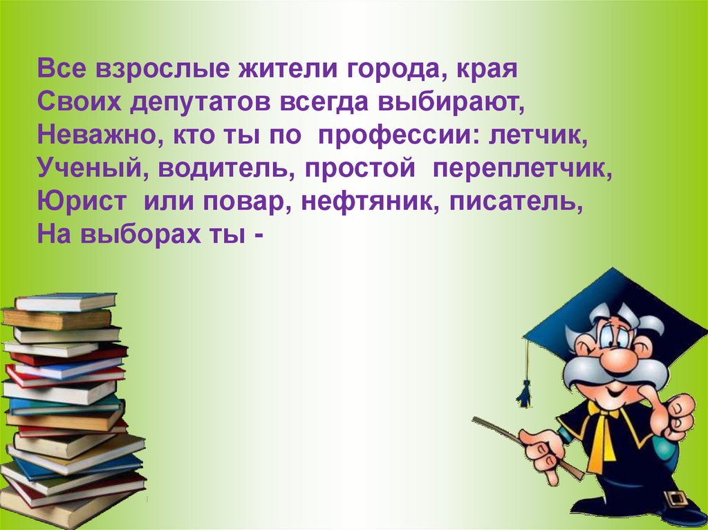 Все взрослые жители города, краяСвоих депутатов всегда выбирают,