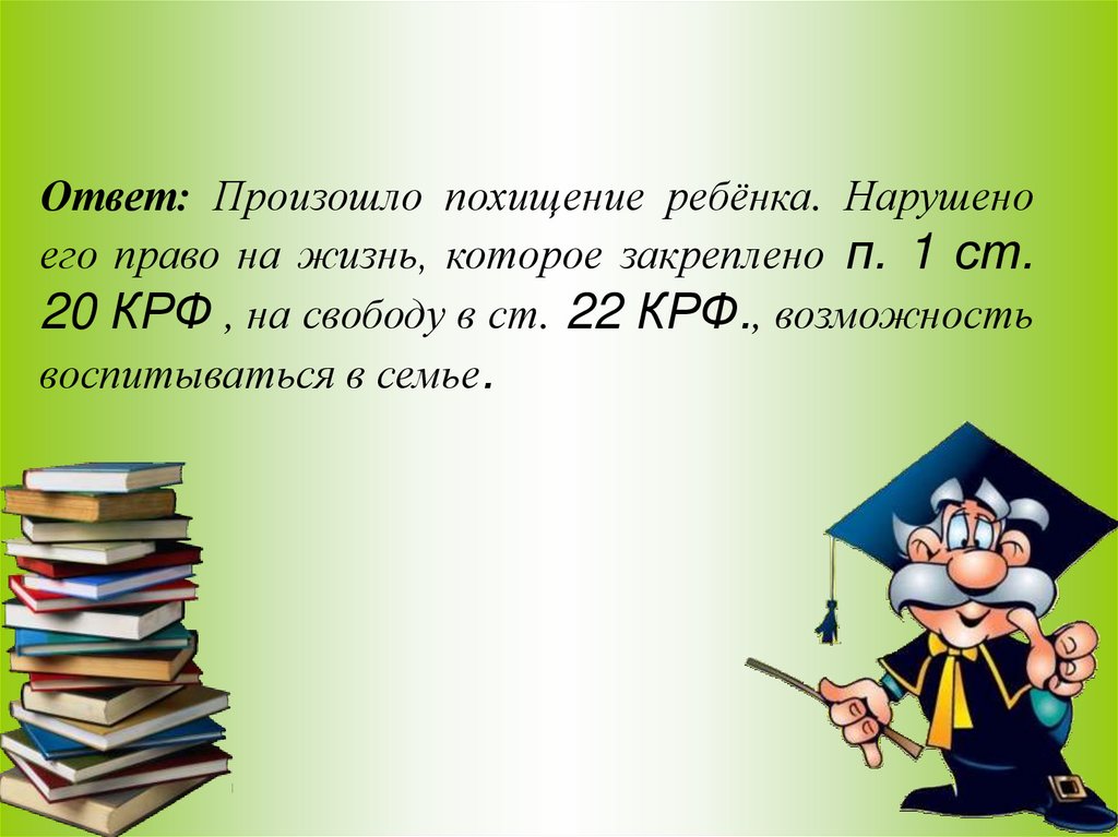 Ответ: Произошло похищение ребёнка. Нарушеноего право на жизнь, которое закреплено п. 1 ст.
