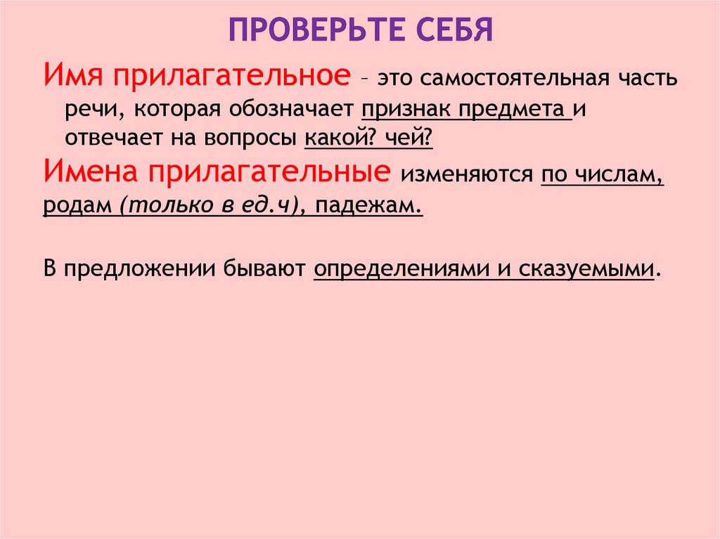 Имя прилагательное – это самостоятельная частьречи, которая обозначает признак предмета и