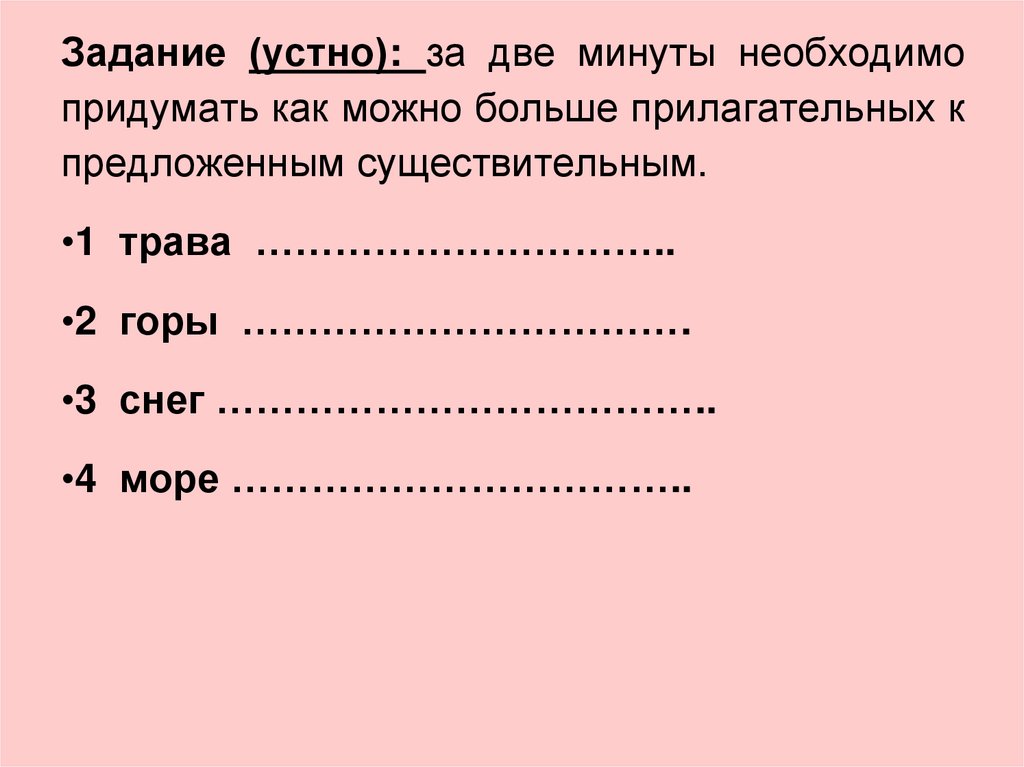 Задание (устно): за две минуты необходимопридумать как можно больше прилагательных к
