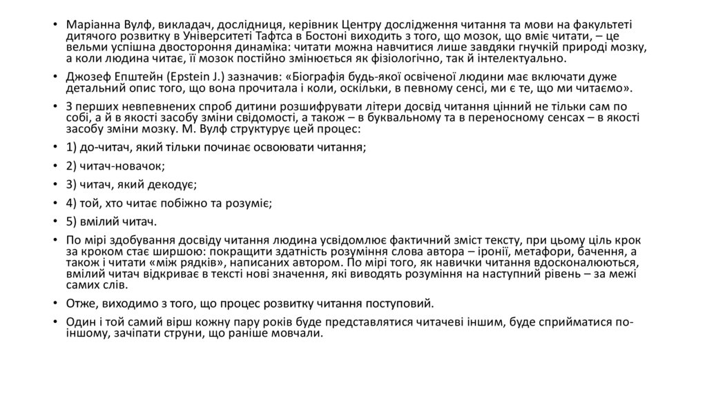 • Маріанна Вулф, викладач, дослідниця, керівник Центру дослідження читання та мови на факультетідитячого розвитку в Університеті Тафтса в Бостоні виходить з того, що мозок, що вміє читати, – це