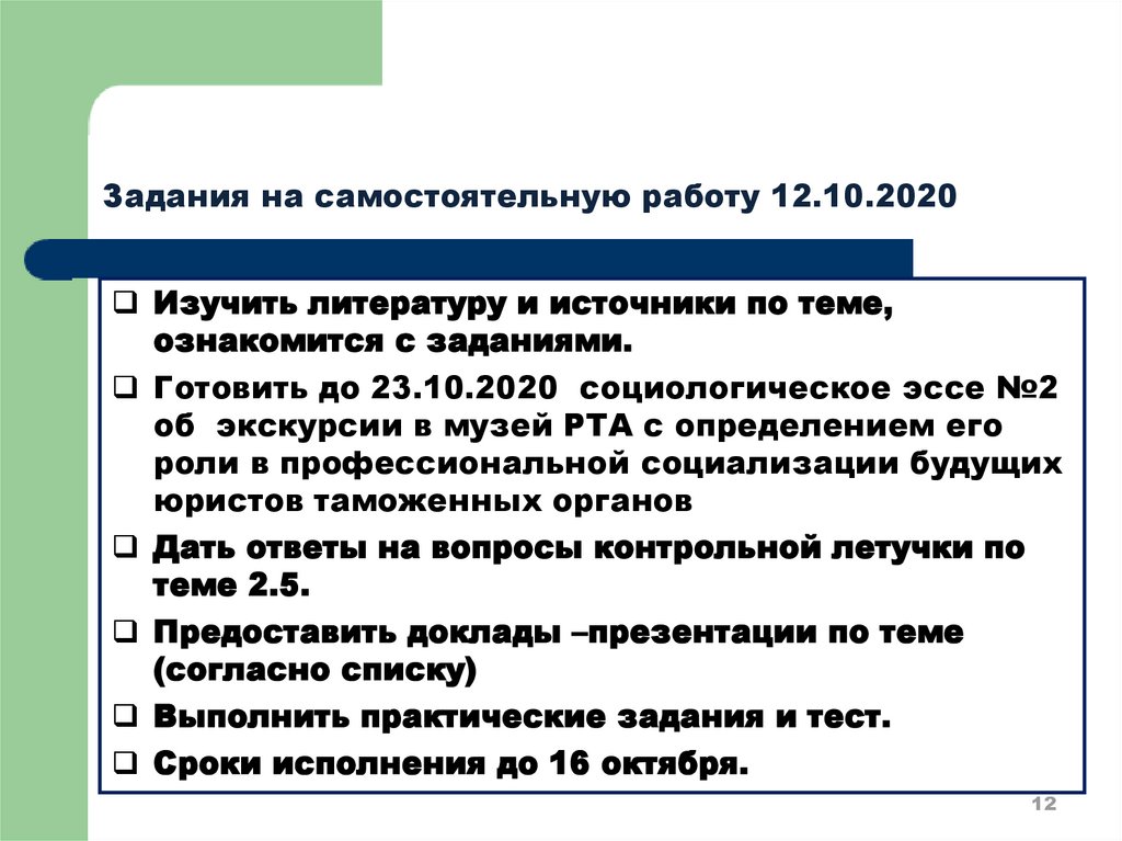 Задания на самостоятельную работу 12.10.2020Изучить литературу и источники по теме,