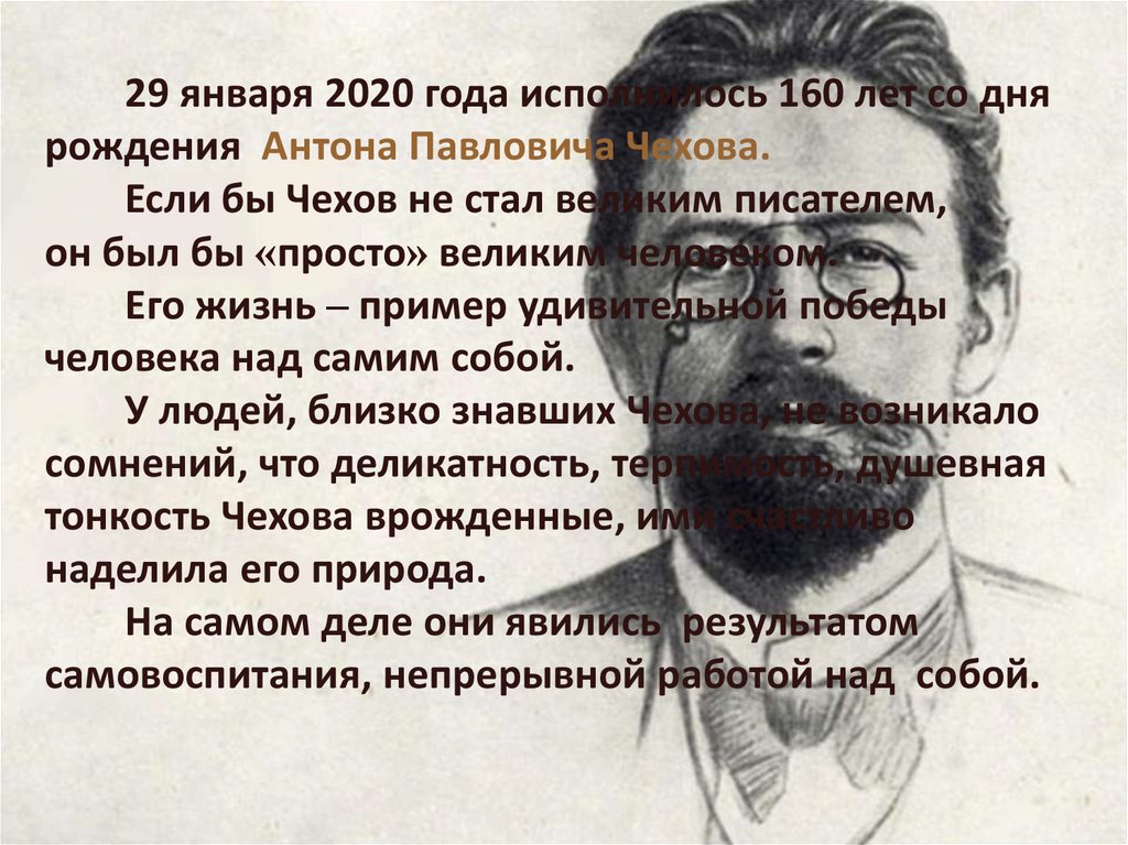 29 января 2020 года исполнилось 160 лет со днярождения Антона Павловича Чехова.