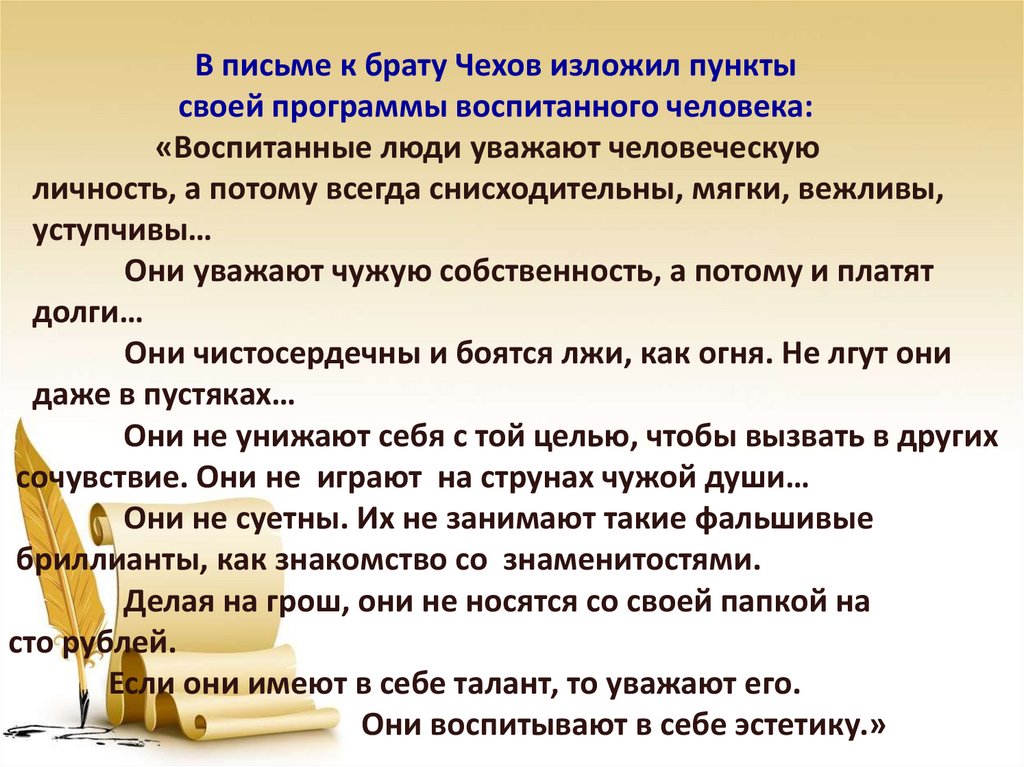 В письме к брату Чехов изложил пунктысвоей программы воспитанного человека:
