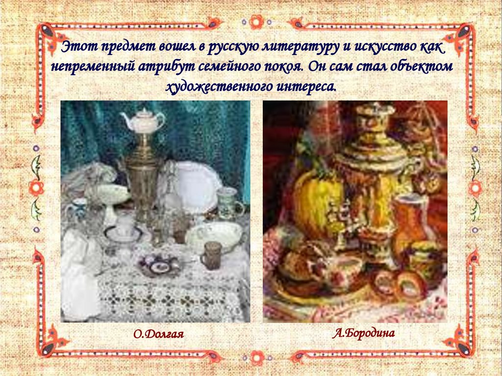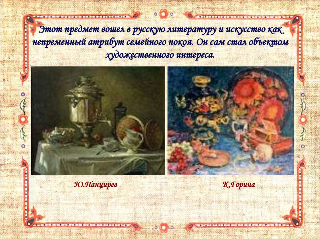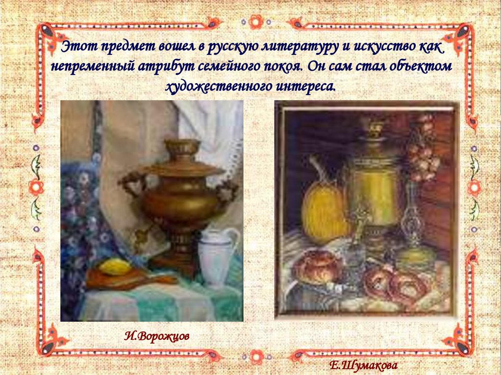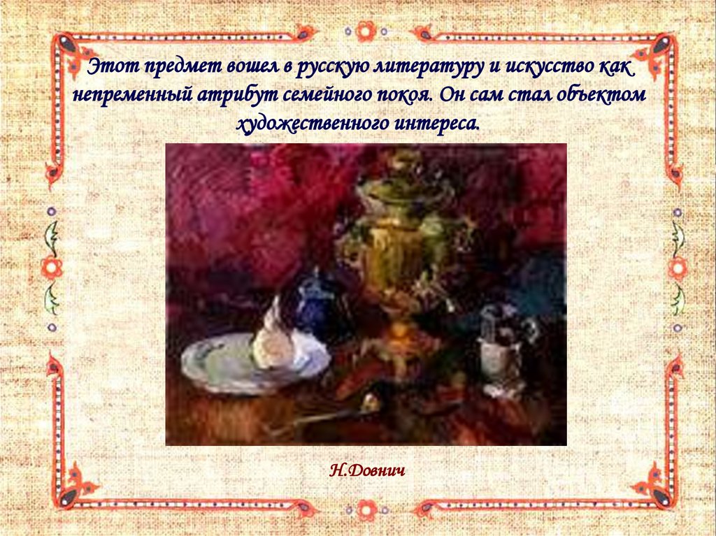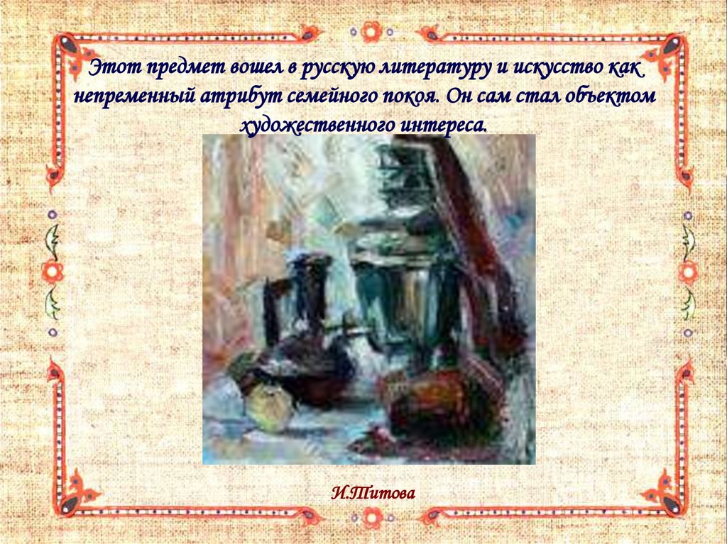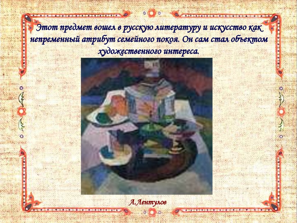 Этот предмет вошел в русскую литературу и искусство какнепременный атрибут семейного покоя. Он сам стал объектом