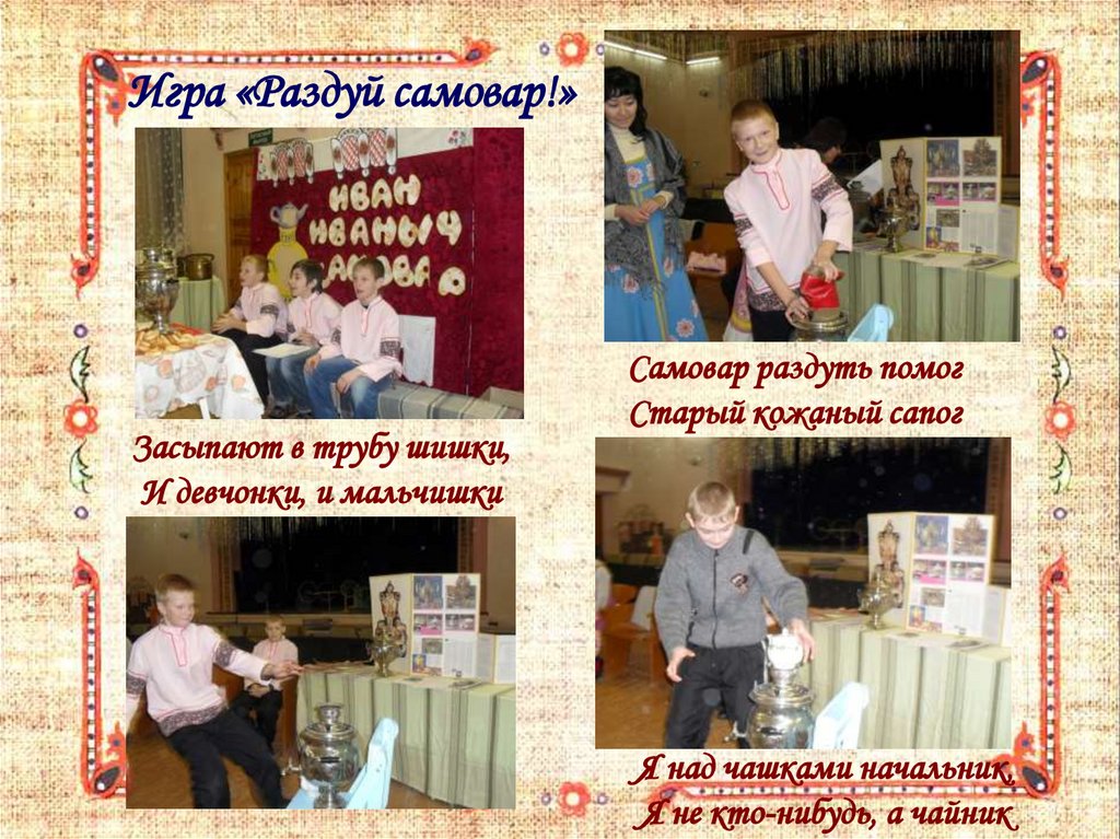 Игра «Раздуй самовар!»Засыпают в трубу шишки,