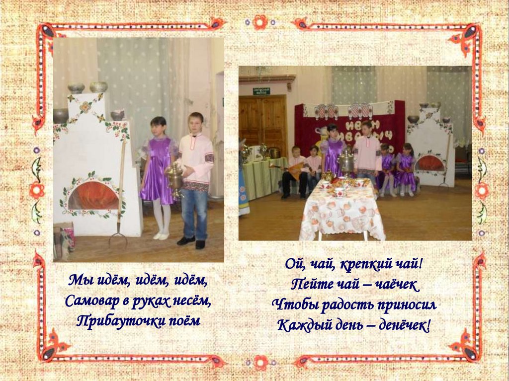 Мы идём, идём, идём,Самовар в руках несём,