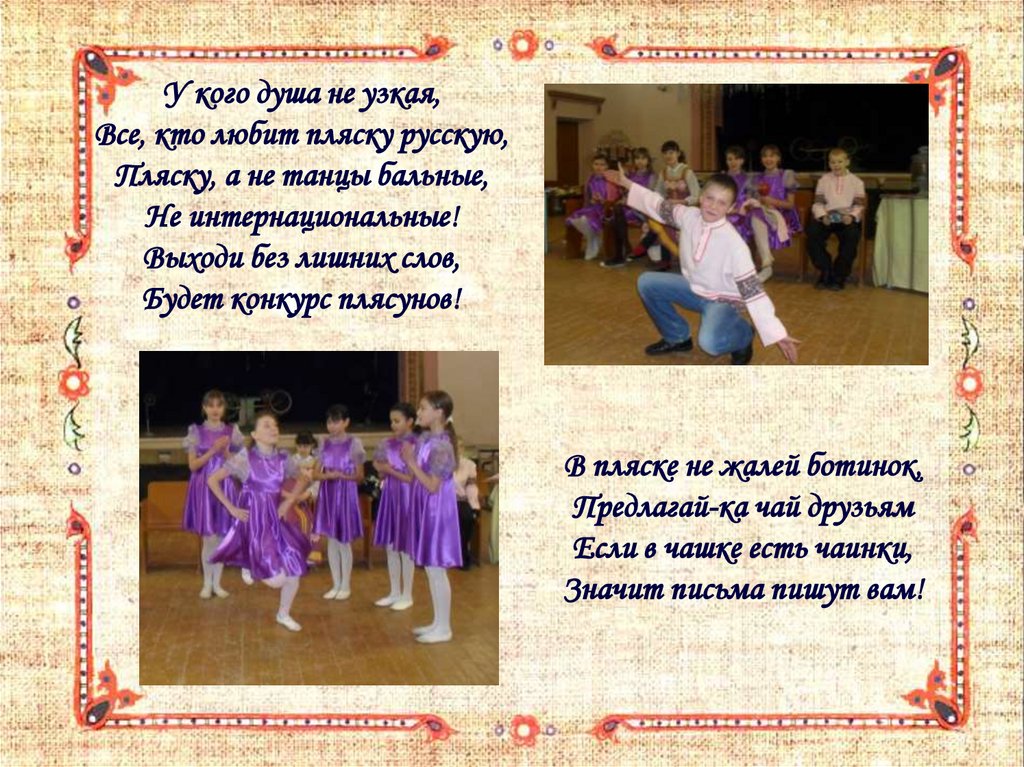 У кого душа не узкая,Все, кто любит пляску русскую,
