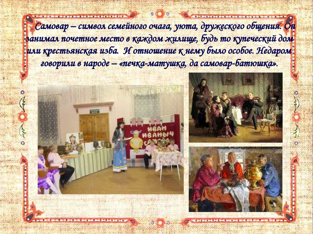 Самовар – символ семейного очага, уюта, дружеского общения. Онзанимал почетное место в каждом жилище, будь то купеческий дом