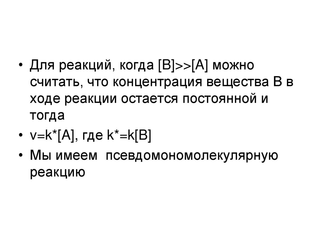 • Для реакций, когда [B]>>[A] можносчитать, что концентрация вещества В в