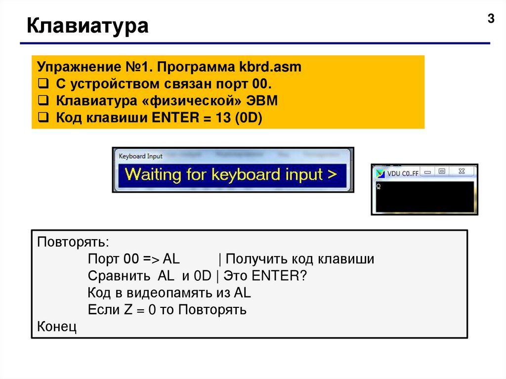 КлавиатураУпражнение №1. Программа kbrd.asm