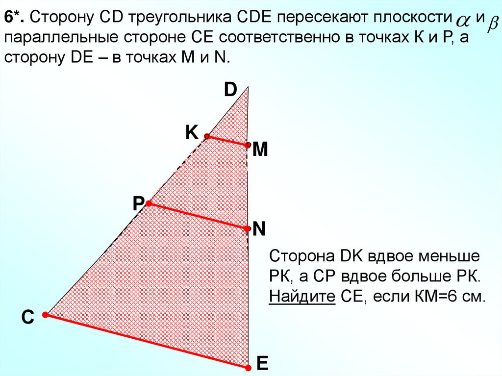 6*. Сторону СD треугольника СDE пересекают плоскости ипараллельные стороне СЕ соответственно в точках К и Р, а