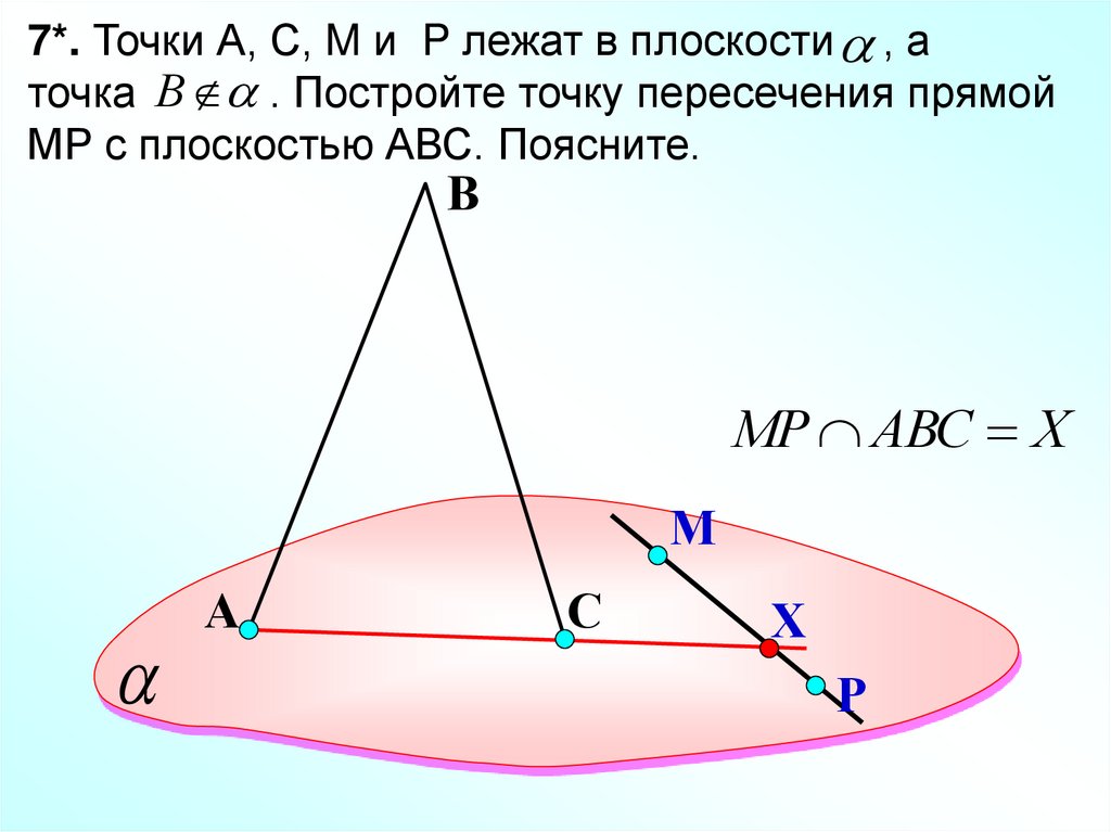 7*. Точки А, С, M и P лежат в плоскости , аточка В . Постройте точку пересечения прямой