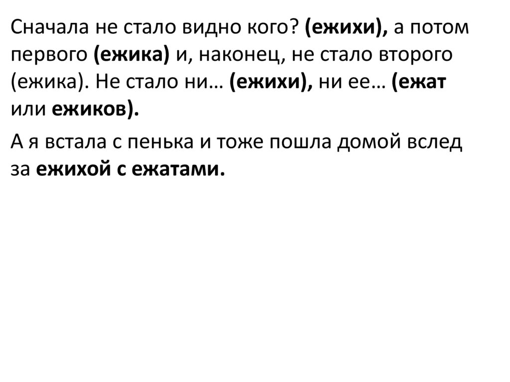 Сначала не стало видно кого? (ежихи), а потомпервого (ежика) и, наконец, не стало второго