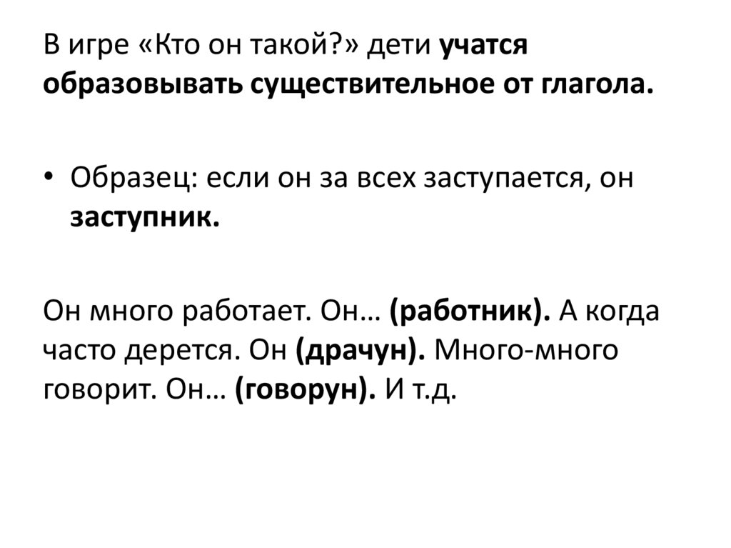 В игре «Кто он такой?» дети учатсяобразовывать существительное от глагола.