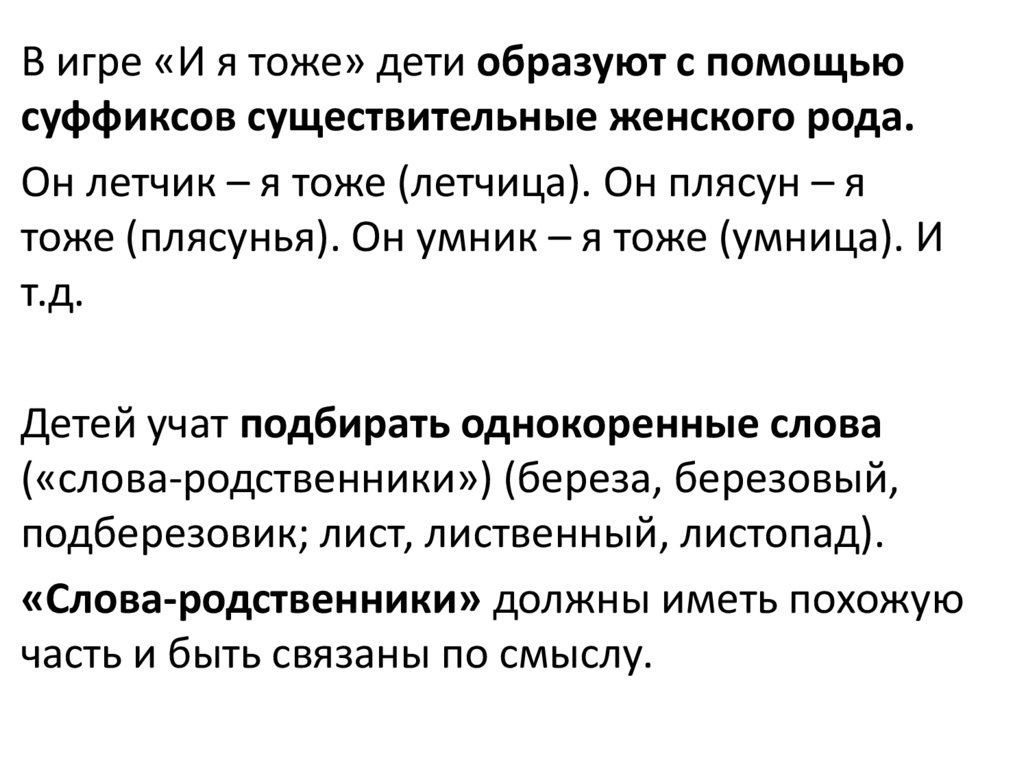 В игре «И я тоже» дети образуют с помощьюсуффиксов существительные женского рода.
