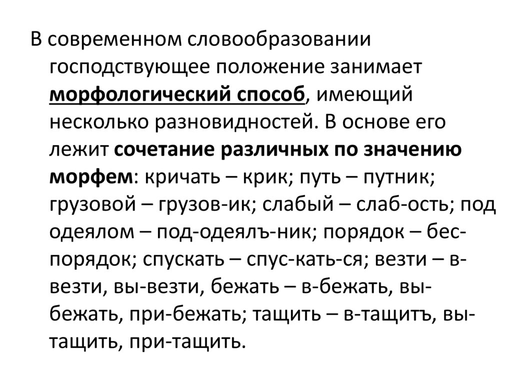 одеялом – под-одеялъ-ник; порядок – беспорядок; спускать – спус-кать-ся; везти – ввезти, вы-везти, бежать – в-бежать, выбежать, при-бежать; тащить – в-тащитъ, вытащить, при-тащить.
