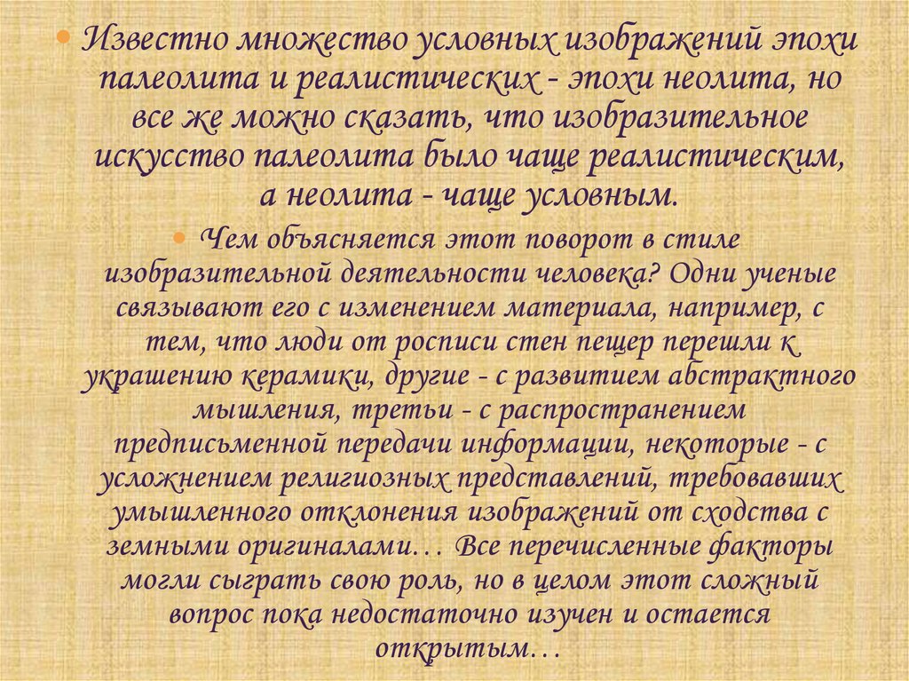 Известно множество условных изображений эпохипалеолита и реалистических - эпохи неолита, но