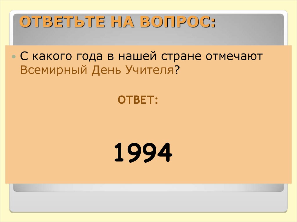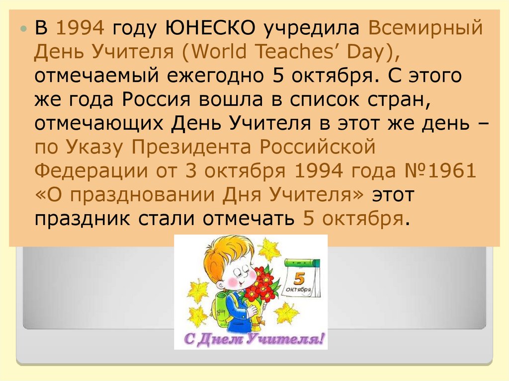 В 1994 году ЮНЕСКО учредила ВсемирныйДень Учителя (World Teaches’ Day),