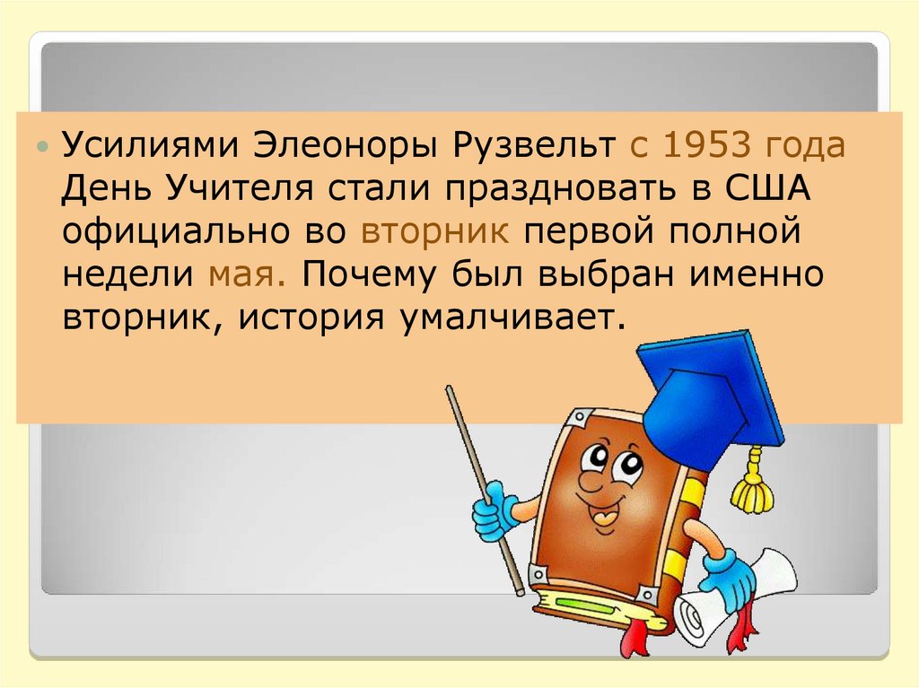 Усилиями Элеоноры Рузвельт с 1953 годаДень Учителя стали праздновать в США
