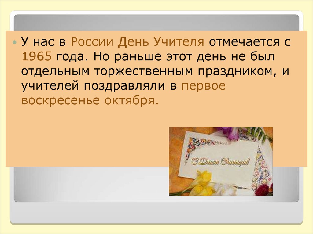У нас в России День Учителя отмечается с1965 года. Но раньше этот день не был