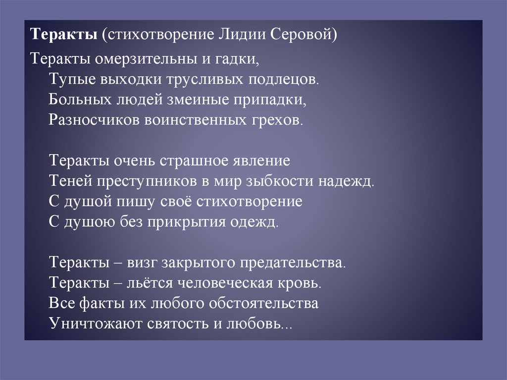 Теракты (стихотворение Лидии Серовой)Теракты омерзительны и гадки,