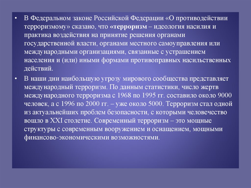 • В Федеральном законе Российской Федерации «О противодействиитерроризмому» сказано, что «терроризм – идеология насилия и