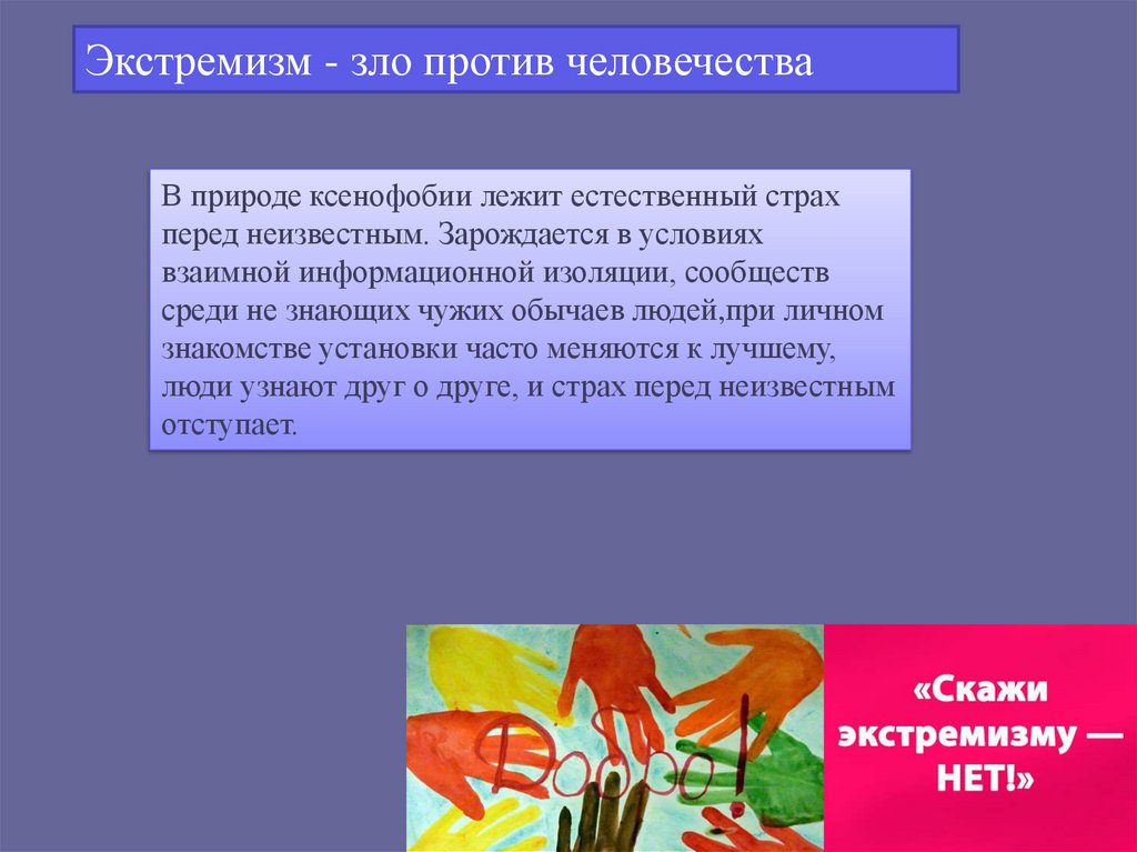 Экстремизм - зло против человечестваВ природе ксенофобии лежит естественный страх