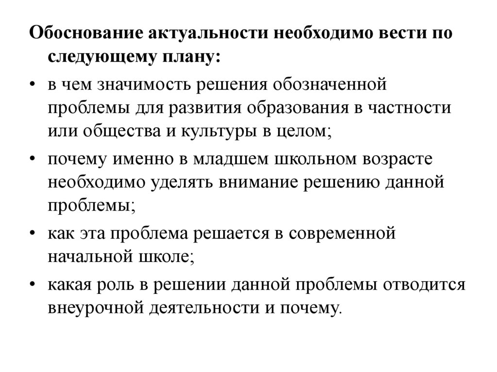 Обоснование актуальности необходимо вести последующему плану: