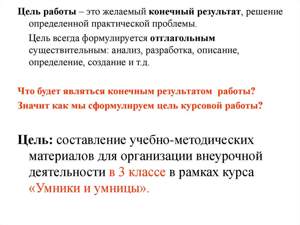 Цель работы – это желаемый конечный результат, решениеопределенной практической проблемы.