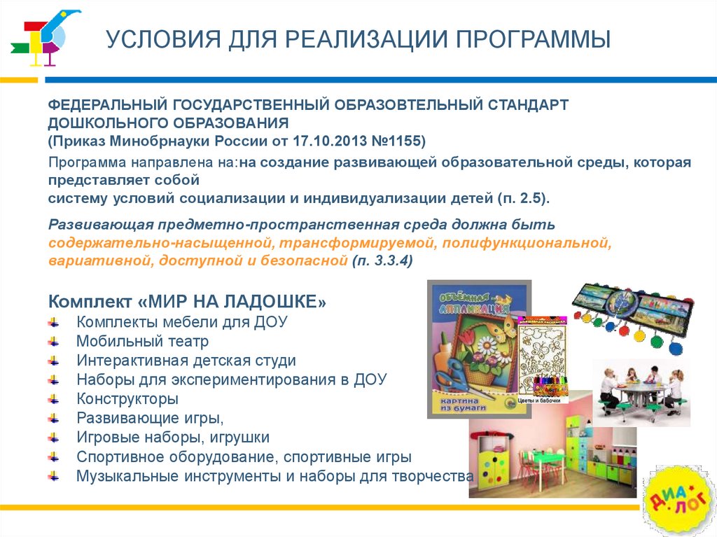 УСЛОВИЯ ДЛЯ РЕАЛИЗАЦИИ ПРОГРАММЫКомплект развивающей среды «МИР НА ЛАДОШКЕ»