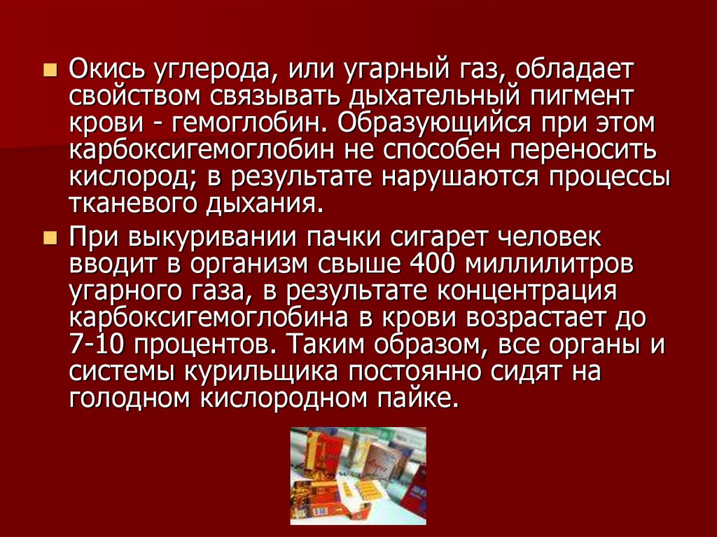 Окись углерода, или угарный газ, обладаетсвойством связывать дыхательный пигмент