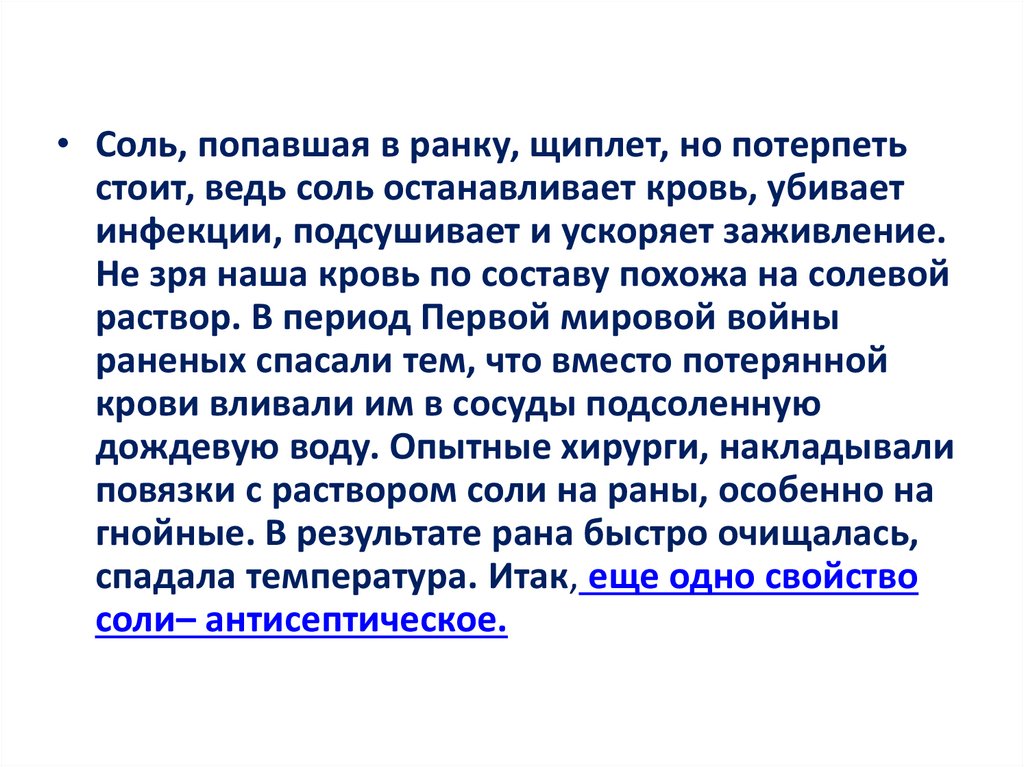 • Соль, попавшая в ранку, щиплет, но потерпетьстоит, ведь соль останавливает кровь, убивает