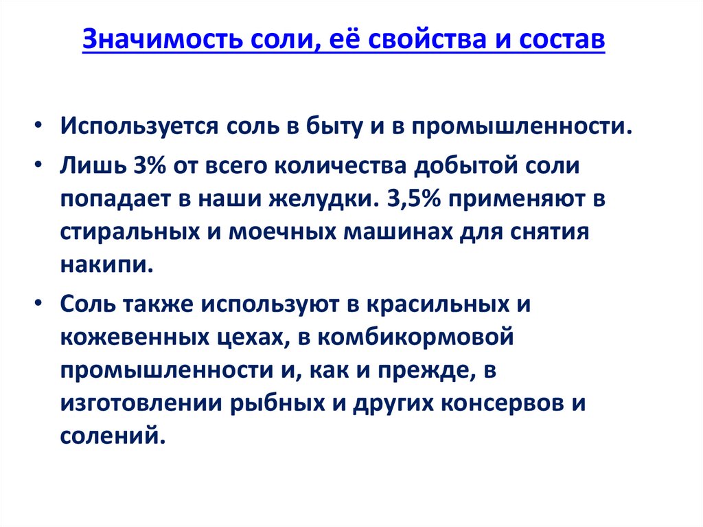Первое свойство соли – то, что она соленая на вкус. Поэтомуее используют для соления пищи.