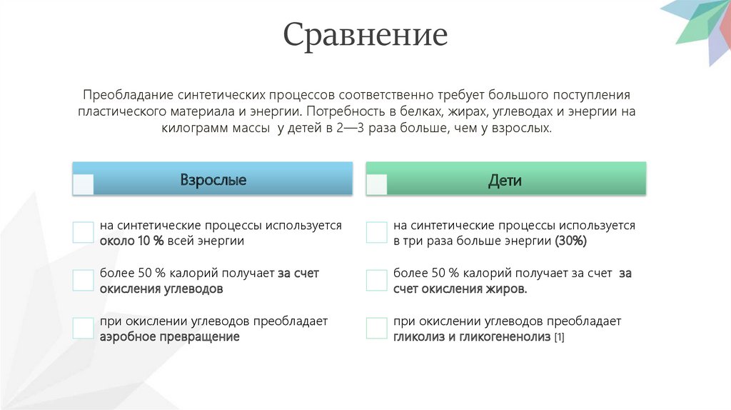 СравнениеПреобладание синтетических процессов соответственно требует большого поступления