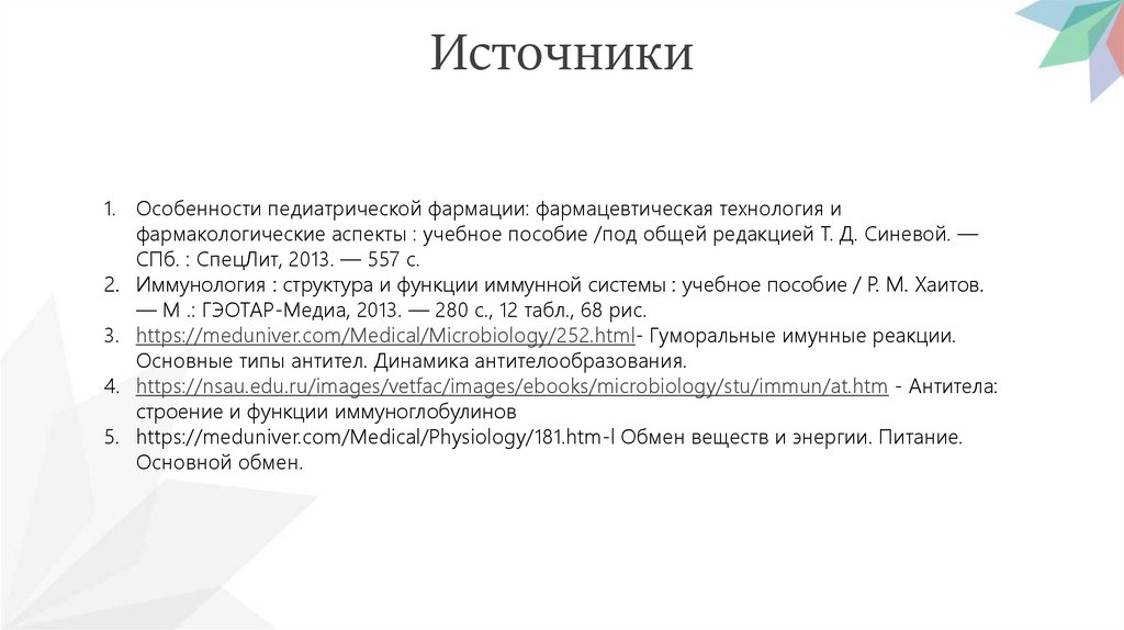 Источники1. Особенности педиатрической фармации: фармацевтическая технология и