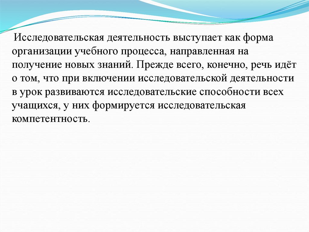 Исследовательская деятельность выступает как формаорганизации учебного процесса, направленная на