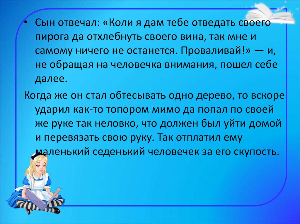 • Сын отвечал: «Коли я дам тебе отведать своегопирога да отхлебнуть своего вина, так мне и