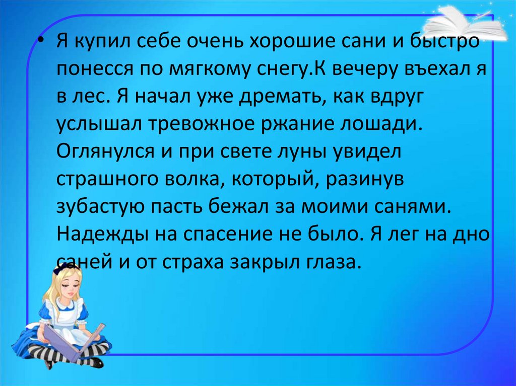 • Я купил себе очень хорошие сани и быстропонесся по мягкому снегу.К вечеру въехал я