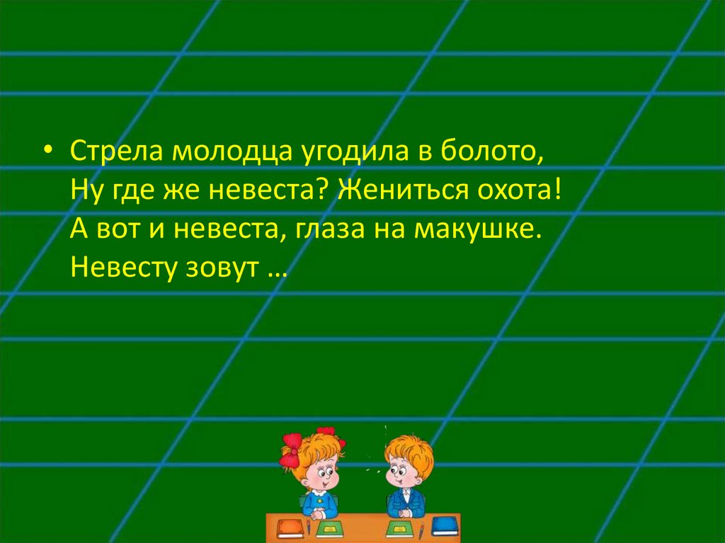 • Стрела молодца угодила в болото,Ну где же невеста? Жениться охота!