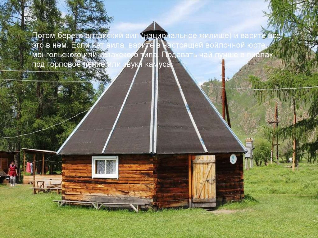 Потом берете алтайский аил (национальное жилище) и варите всеэто в нем. Если нет аила, варите в настоящей войлочной юрте,