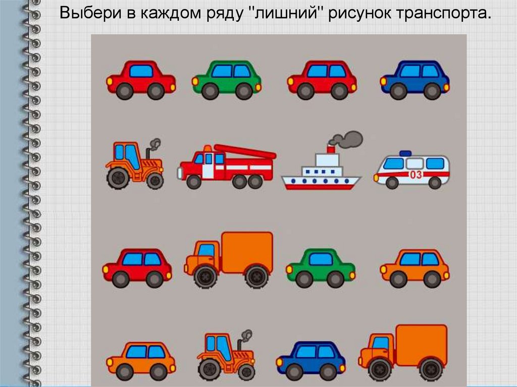 Выбери в каждом ряду "лишний" рисунок транспорта.12.