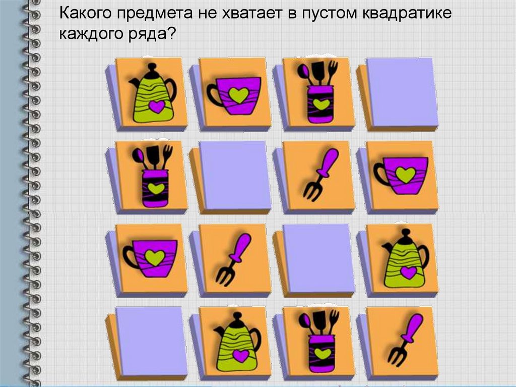 Какого предмета не хватает в пустом квадратикекаждого ряда?