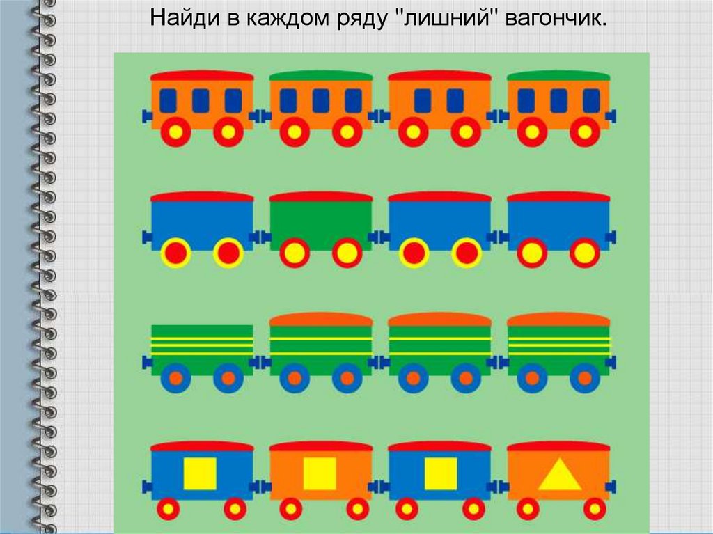 Найди в каждом ряду "лишний" вагончик.18.