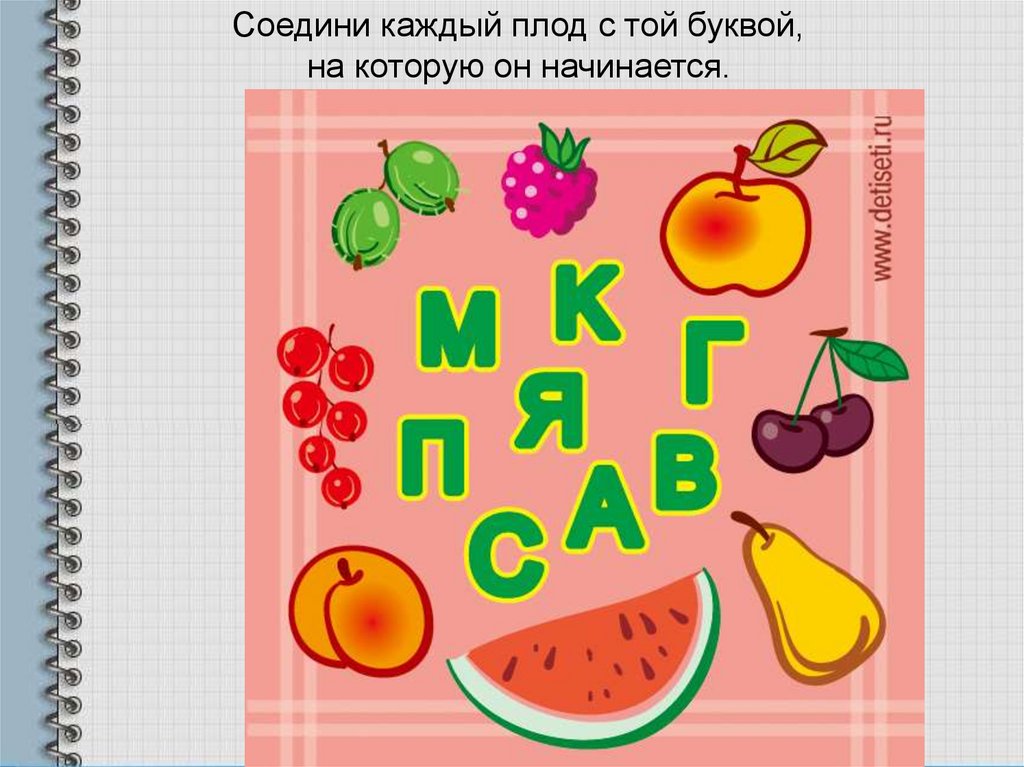 Соедини каждый плод с той буквой,на которую он начинается.