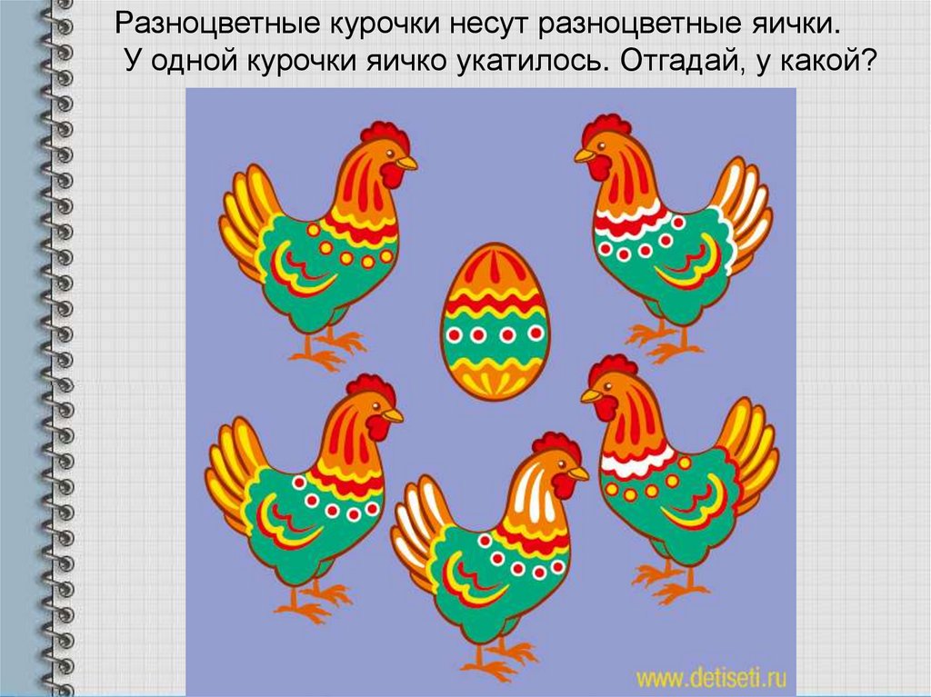 Разноцветные курочки несут разноцветные яички.У одной курочки яичко укатилось. Отгадай, у какой?