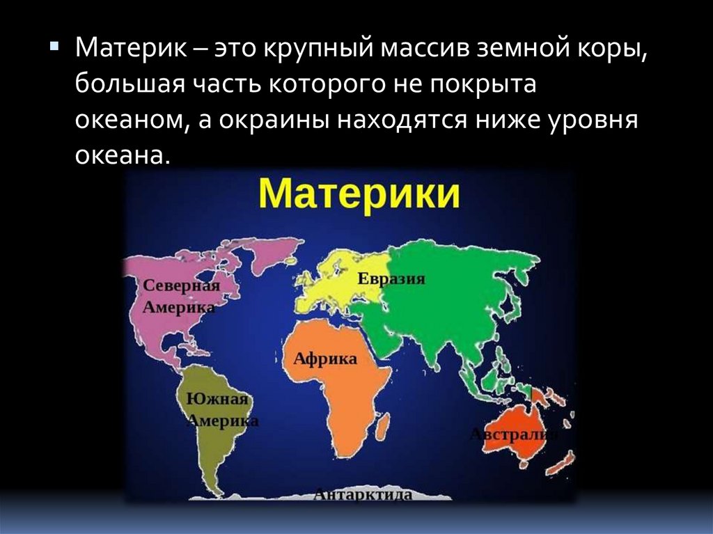 Материк – это крупный массив земной коры,большая часть которого не покрыта