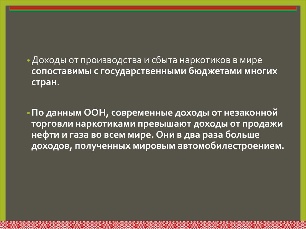 • Доходы от производства и сбыта наркотиков в миресопоставимы с государственными бюджетами многих